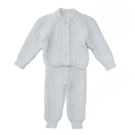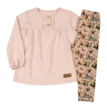 2 daļīgais komplekts mazai meitenei sastāv no stilīga džemperīša ar elegantu volānu un ērtām biksēm.